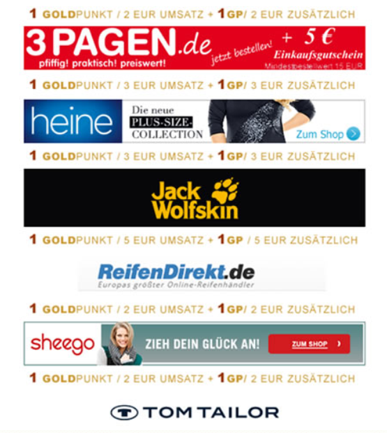 - doppelte Punkte: 2 Goldpunkte je 5 Euro Umsatz bei Tom Tailor