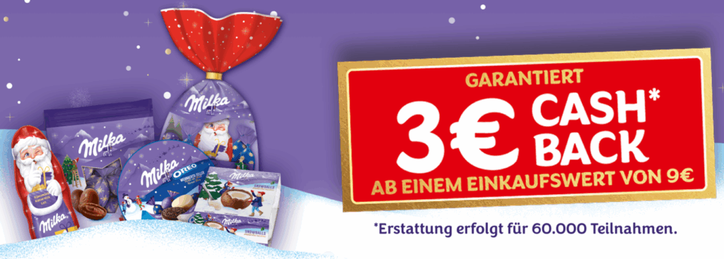 Entdecke den süßen Vorteil: Hol dir jetzt leckere Produkte von Milka, gönn dir eine köstliche Auswahl und lass dir dafür bares Geld zurückerstatten – ganz einfach! Kaufe für mindestens 9 € teilnehmende Milka-Weihnachtsprodukte, lade deinen Kassenbon hier hoch – und schon bekommst du 3 € Cashback. Perfekt, um dich in der Vorweihnachtszeit zu verwöhnen oder Freunden und Familie in der Genusszeit eine Freude zu machen.